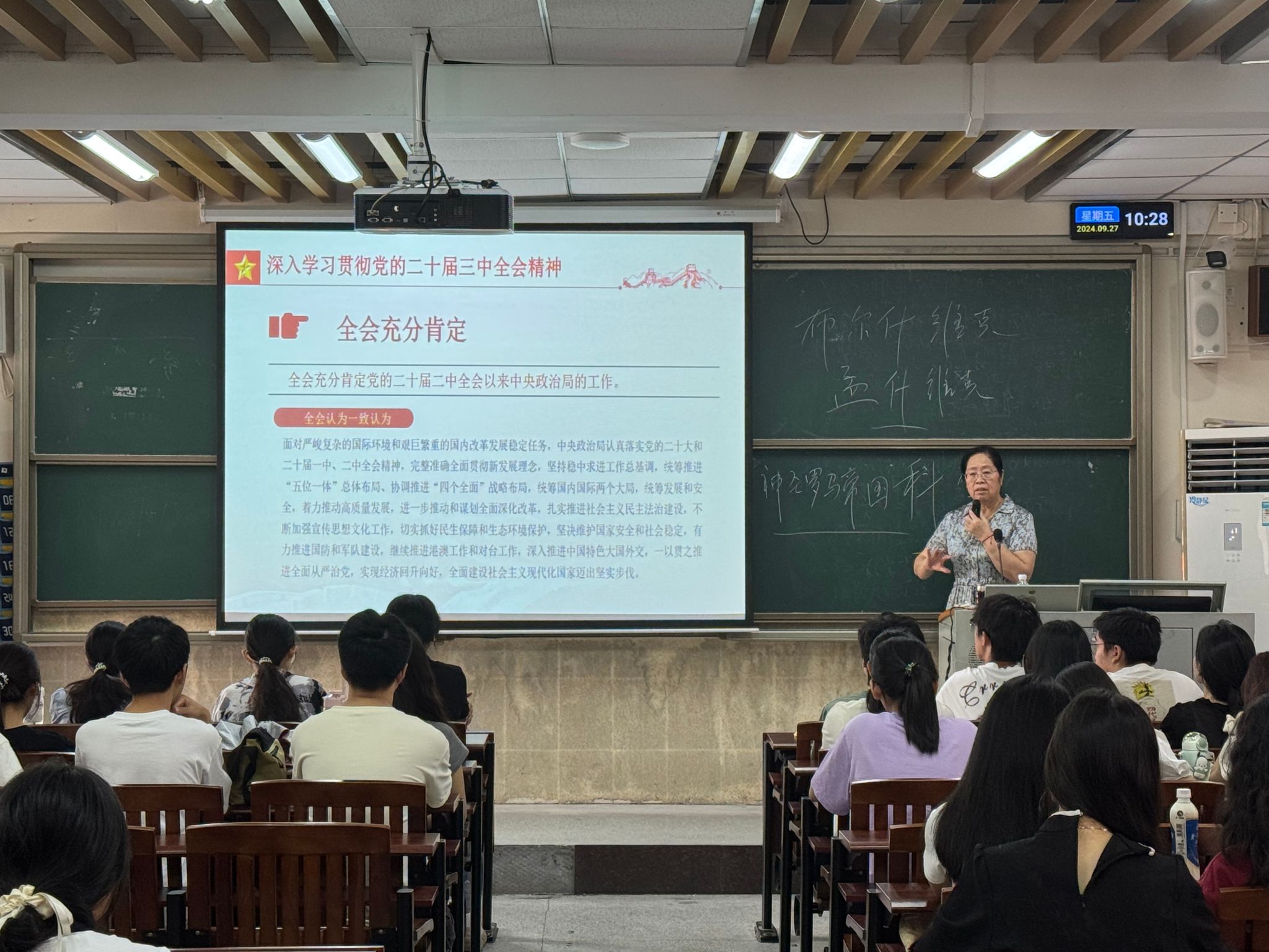 郑玉敏以“高举旗帜,强国有我”为题,带领同学们深入学习党的二十届三中全会精神。她从当前错综复杂的国际形势和国内改革发展的重任出发,全面解读了党的二十届三中全会对进一步全面深化改革的战略部署。郑玉敏指出,党的二十届三中全会是在以中国式现代化全面推进强国建设、民族复兴伟业的关键时期召开的一次十分重要的会议,同学们要将全会精神转化为学习动力,以更加坚定的信念、更加昂扬的斗志,奋力书写改革发展新答卷。