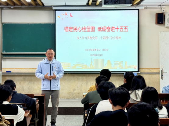 党委书记杜应发以“锚定民心绘蓝图,砥砺奋进十五五”为题,向全体学生党员、入党积极分子宣讲党的二十届四中全会精神。