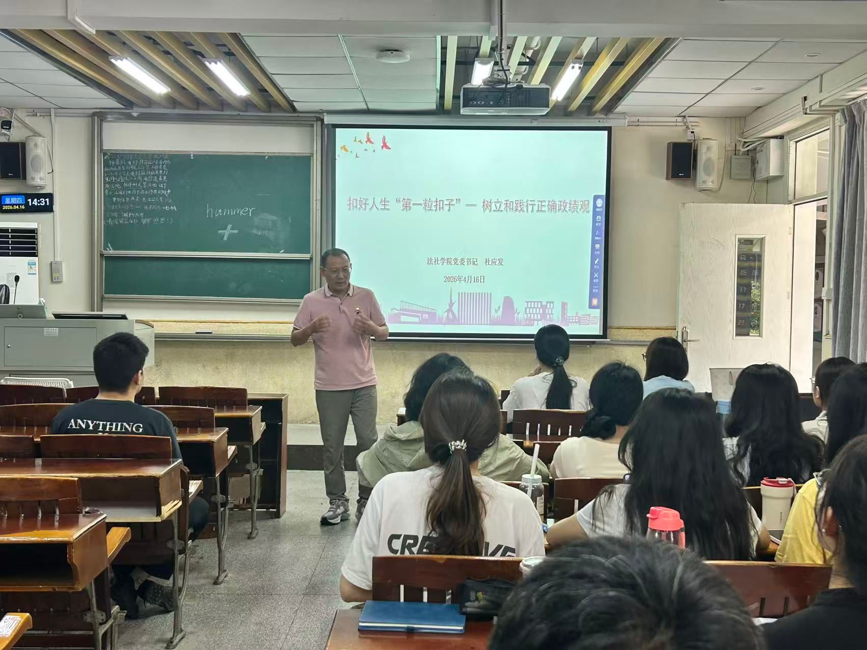 党委书记杜应发以“扣好人生‘第一粒扣子’--树立和践行正确政绩观”为题,为学院全体学生党员讲专题党课。