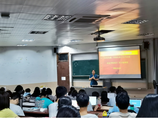 院长郑玉敏在莞城校区6#1为2020会计卓越1班、2020金融管理产学国际1班、2020国际商务产学国际1班、2020法学卓越1班等100多位同学上了一堂题为“奋斗百年路 启航新征程”的思政第一课,与同学们共同学习了习近平总书记在庆祝中国共产党成立100周年大会上的重要讲话精神。