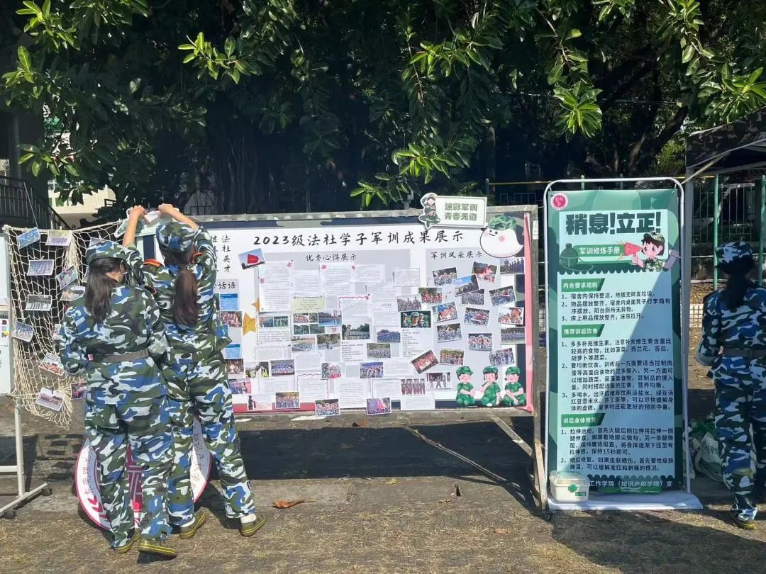 在营地处设有线下宣传板块,围绕训练风采,心得展示,助班寄语,训后修复小技巧等方面展开。利用学院公众号、院网等平台积极宣传新生军训生活,取得良好的宣传效果。