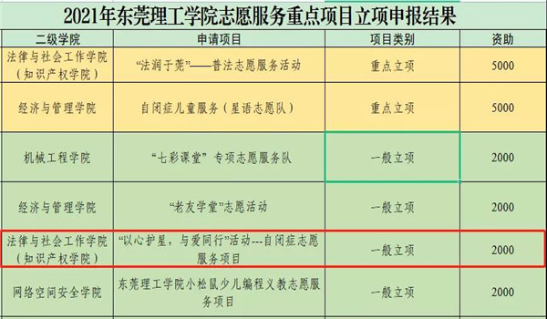 爱星志愿服务队“‘以心护星,与爱同行’活动——自闭症志愿服务”项目成功被学校评选为东莞理工学院志愿服务重点项目的一般立项。