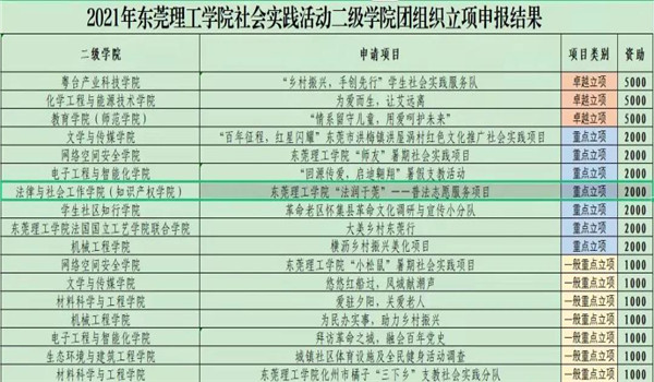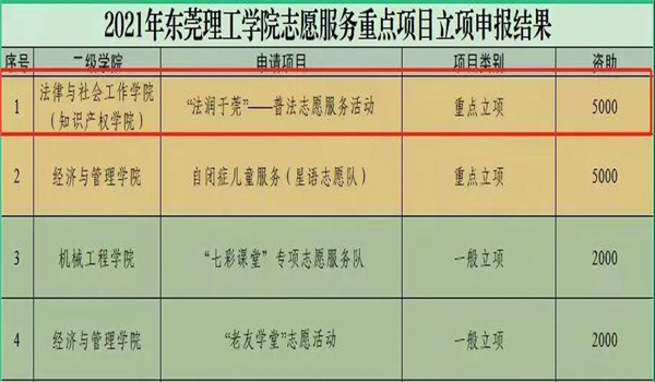 此外,“法润于莞——普法志愿服务活动”项目还获得了“2021年东莞理工学院志愿服务重点项目立项”,以及“2021年东莞理工学院社会实践活动二级团组织立项”。