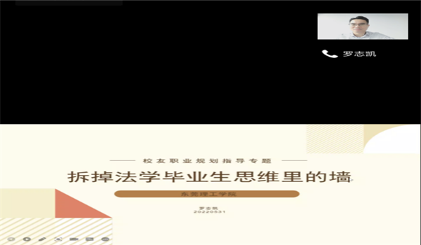 邀请2008届优秀校友罗志凯师兄为即将步入大四毕业的法学专业学生作就业规划指导。会上,罗师兄首先介绍2022年东莞律师行业的现状,鼓励大家要敢于挑战;随后他结合自己毕业十余年来丰富的法务经验为同学们总结讲述了十种关于职业规划的认知观点,比如要转换习以为常的心智模式、找到自己所热爱的,创造不确定性,成功学不能学等等,引导同学们树立正确的观念,传播正能量。