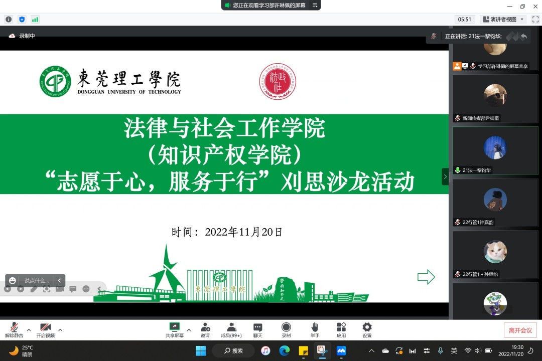 于2022年11月20日在腾讯会议举办第二期刈思沙龙:“志愿于心,服务于行”志愿活动分享。本次活动邀请了2021级社会工作2班的刘楠楠同学和2022级行政管理1班(专升本)的谢美兰同学作为主讲人,作为广东省三星级志愿者,她们分享了自己对于志愿服务的独特见解。