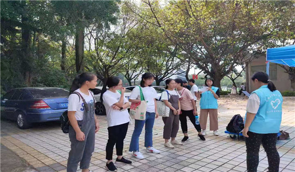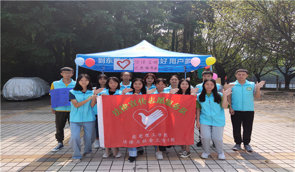 的法律宣传志愿服务队在东莞理工学院莞城校区第一饭堂门口开展防诈骗摆摊活动。