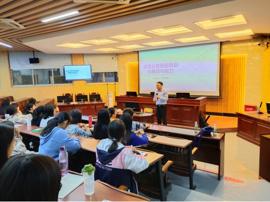 20191121日晚,公共管理系在莞城校区模拟法庭面向2019级行政管理专业同学举办了一场主题沙龙活动,特邀东莞海丽集团副总经理、松山湖家庭教育促进会秘书长周照杨老师为大家分享公务员应该具备的素质与能力。