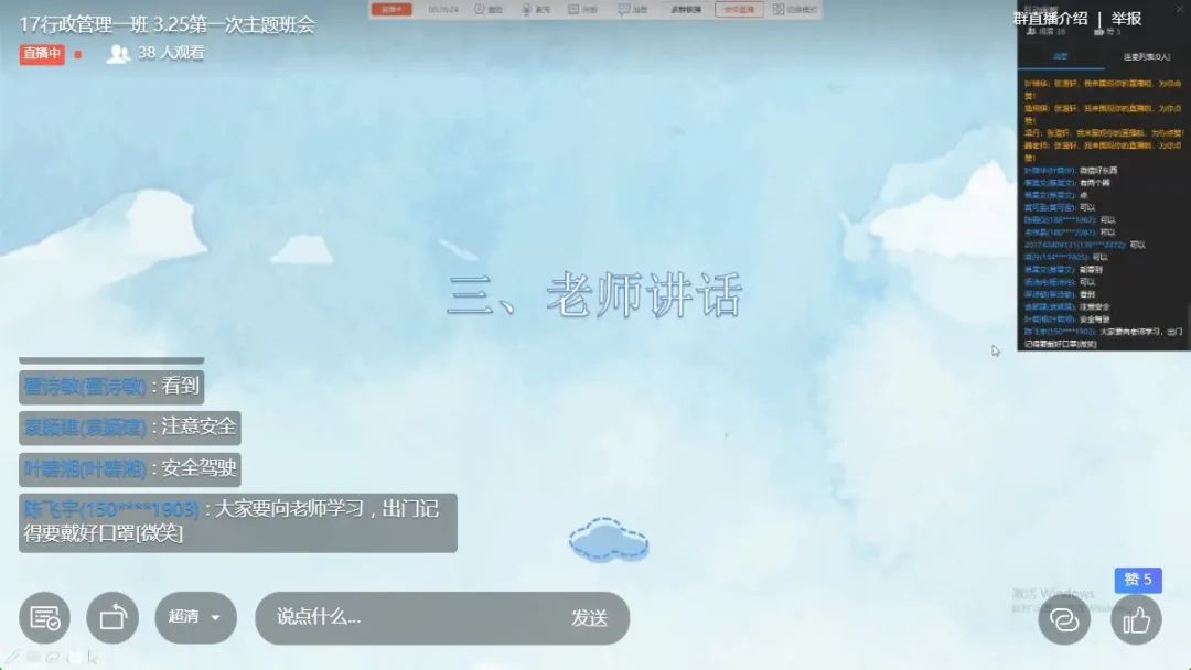 班主任魏红征老师也带着叮嘱参与到其中来,结合当下,给同学们提出了对于疫情期间所发生事情的一些思考。希望同学们多关注时政新闻,多思考,多学习,多读书充实自己。要看到疫情之中社会发展的变化,比如线上的网课带来的冲击,互联网发展的趋势,在疫情期间我们能认知和学习到平时不注意或学不到的东西。作为一位行政管理专业的学生,要时刻具有公共精神和公共意识,用公共管理的视角看待问题,提出自己的观点,并且能够条理清晰分明的解释。最后,老师也向同学们提出了一些期望和关于疫情防控的注意事项。