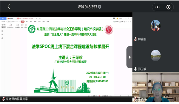 利用腾讯会议平台特邀广东外语外贸大学法学院王荣珍教授为全院师生开展一次题为“法学SPOC线上线下混合课程建设与教学展开”的主题讲座。院长郑玉敏、副院长朱晓红、沈亚萍以及各系主任、专任教师以及部分学生代表参加了此次活动。