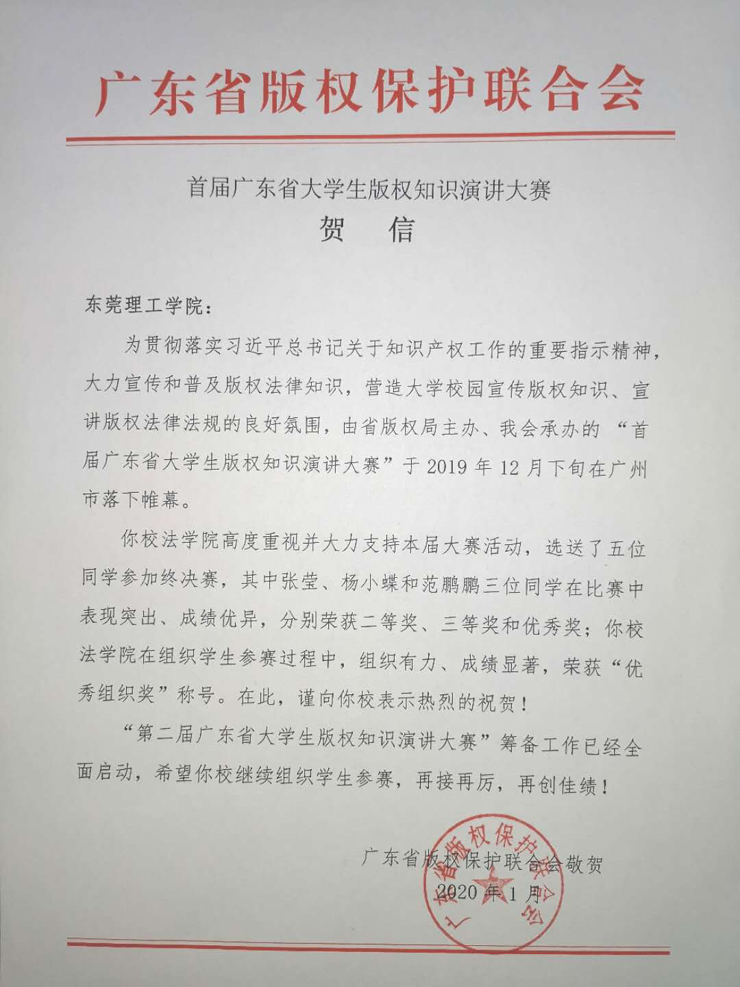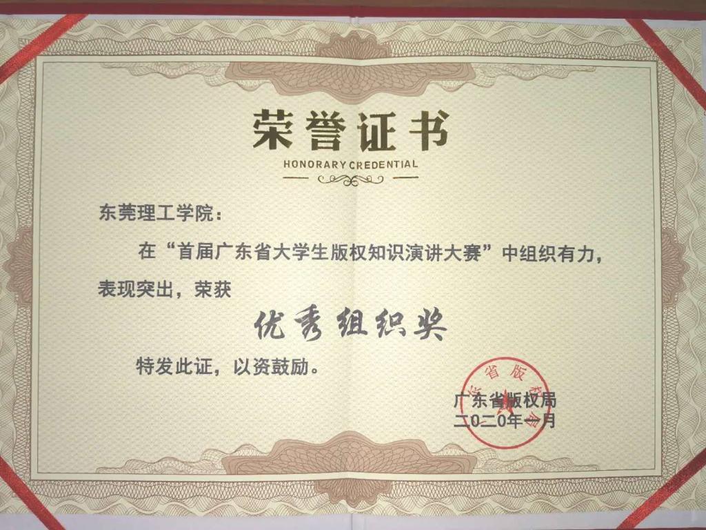 近日,“首届广东省大学生版权知识演讲大赛”所有奖项敲定。东莞理工学院不负众望,勇夺“优秀组织奖”荣誉并收到广东省版权保护联合会发来的贺信。