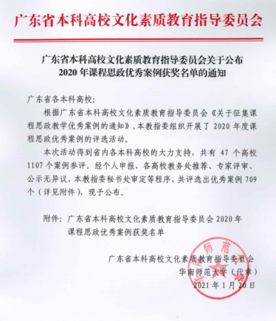 为大力提升课程思政的教学质量,2020年广东省本科高校文化素质教育指导委员会特面向全省各本科高校广泛征集课程思政优秀教学案例,以大力推动全省高校课程思政建设与改革,提升课程思政育人实效。
