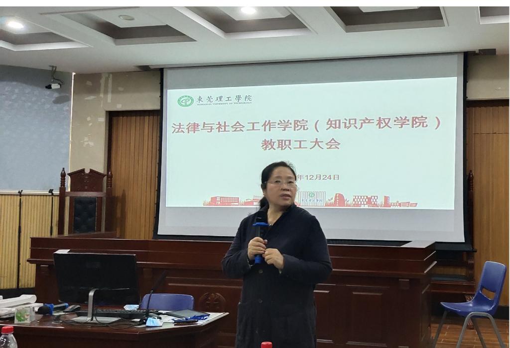 在莞城校区模拟法庭召开全院教职工大会,会议对2020年学院工作和分工会工作进行总结,学院全体老师参加会议。