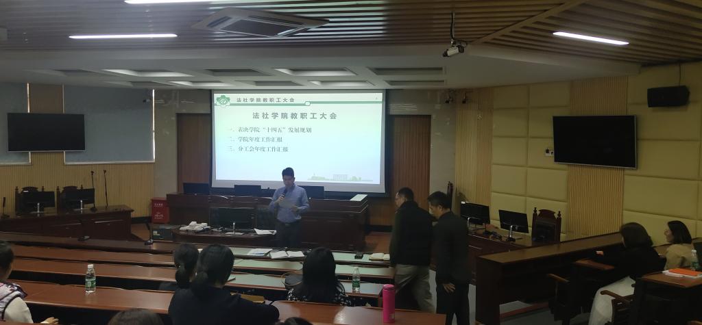 在莞城校区模拟法庭召开全员大会,会议由学院党委书记杜应发主持,学院近50名教职工出席了会议。