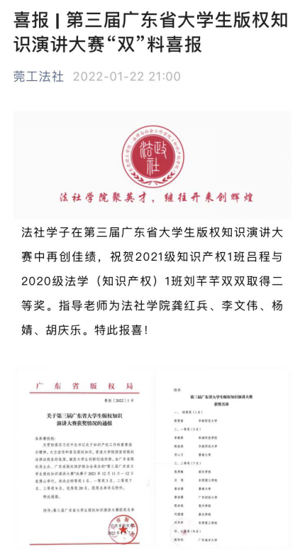 喜报|法社学子在第三届广东省大学生版权知识演讲大赛获得两个二等奖
