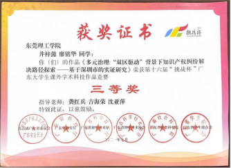 特色活动7:组织同学参加第十六届广东省大学生课外学术科技作品竞赛,荣获 三等奖(井子懿、廖铭华)
