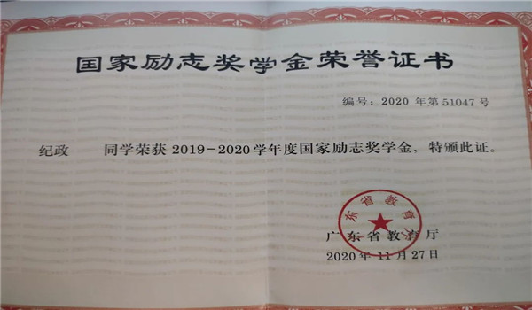 纪政,2019级社会工作专业1班学生。学习绩点达4.16;2019年9月军训标兵;2020年6月获得校级大学生创新创业立项;2020年11月获得广东省国家励志奖学金;2020年12月获得东莞理工学院三等奖学金;2021年3月入围校级2021年“挑战杯”大学生课外学术科技作品竞赛;2021年6月获得国家级大学生创新创业立项;2021年8月获得广东省一星志愿者称号;2021年11月获得东莞理工学院国家奖学金。
