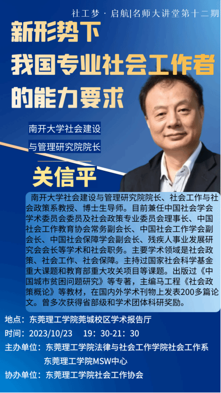 2023年10月23日晚19:30,社会工作系专业品牌活动:社工梦·启航|名师大讲堂第12期讲座在莞城校区学术报告厅举办。本次名师大讲堂邀请到了我国著名社会学家、南开大学博士生导师关信平教授为我校师生做《新形势下我国专业社会工作者的能力要求》的报告。出席本次活动的主要有社会工作系全体学生,天下足球网