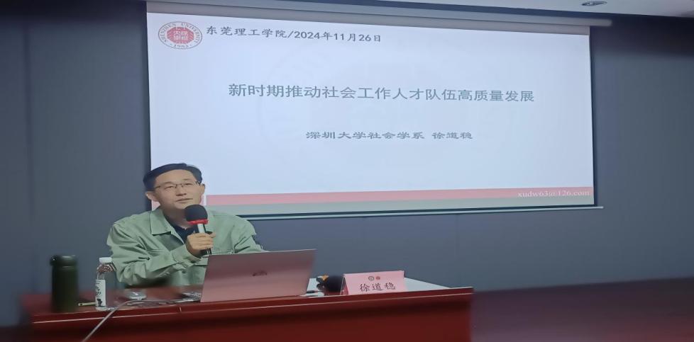 为更好地学习贯彻习近平总书记对社会工作的重要指示精神,2024年11月26日晚,社会工作品牌活动|社工梦·启航|名师大讲堂第15期在莞城校区小剧场举办。本次名师大讲堂活动邀请了深圳大学政府管理学院教授、博士生导师徐道稳教授为我校师生做《新时期推动社会工作人才队伍高质量发展》的学术报告,活动由社会工作系主任成伟教授主持。