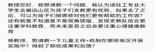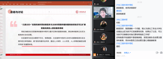 活动议程最后一项实杨慧教授答疑解惑环节。杨慧教授鼓励同学们积极提问,并表明问题可以不局限于儿童社会工作。同学们对讲座分享的内容进行了反馈并与杨慧教授就儿童主任机制进行了更进一步的探讨。同时杨慧教授也以自己的亲身经历为例解答了同学们关于山区儿童支教、儿童社会工作开展技巧等问题。杨慧教授还鼓励并东欢迎莞理工学院社会工作一流专业学生积极报考中央民族大学的研究生。