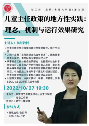 2022年10月27日19点30分,东莞理工学院社会工作系通过线上腾讯会议的方式开展了社工梦启航|名师大讲堂系列活动。本次学术报告邀请了中央民族大学民族学与社会学学院博士生导师杨慧教授,为东莞理工学院社会工作系作《儿童主任政策的地方性实践:理念、机制与运行效果研究》主题报告。参加本次线上学术活动的主要包括东莞理工学院社会工作系全体学生,东莞理工学院社会工作系主任成伟教授,社会工作系副主任张雪老师及社会工作系部分教师。