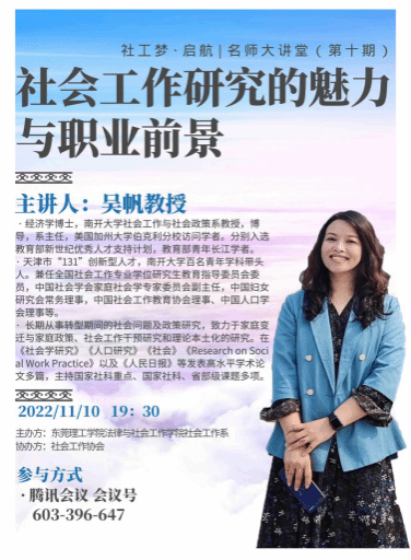 社会工作系通过线上腾讯会议的方式开展了社工梦启航|名师大讲堂系列活动。本次学术报告邀请了南开大学教授吴帆教授,为东莞理工学院社会工作系作《社会工作研究的魅力与职业前景》主题报告。参加本次线上学术活动的主要包括东莞理工学院社会工作系全体学生、社会工作系部分教师以及社会各界对社工发展倾以关注的人士共计400余人。
