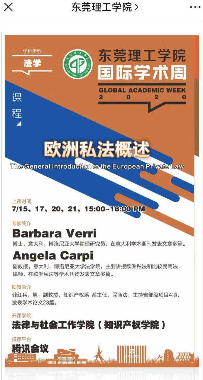 近日,我校举办了首届东莞理工学院国际周(Global Academic Week),为学生提供了一个国际化交流的平台与机会。法律与社会化工作学院(知识产权学院)为全校学生开设了《欧洲私法概述》国际课程。该课程由来自意大利博洛尼亚大学法学院Barbara Verri助理研究员讲授,Barbara Verri,博士,毕业于意大利特伦特大学,主要研究欧洲比较私法,在意大利学术期刊发表多篇关于欧洲私法和比较民商法的文章,兼职律师。 课程的报名情况都非常活跃,本次课程报名人数达60人。