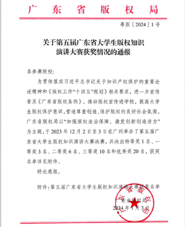 知识产权系龚红兵、李文伟、庄瑞银、胡庆乐老师和我校宣传部邓磊老师、文传学院传媒系李缨副教授的指导下,法社学子在第五届广东省大学生版权知识演讲大赛中再创佳绩。