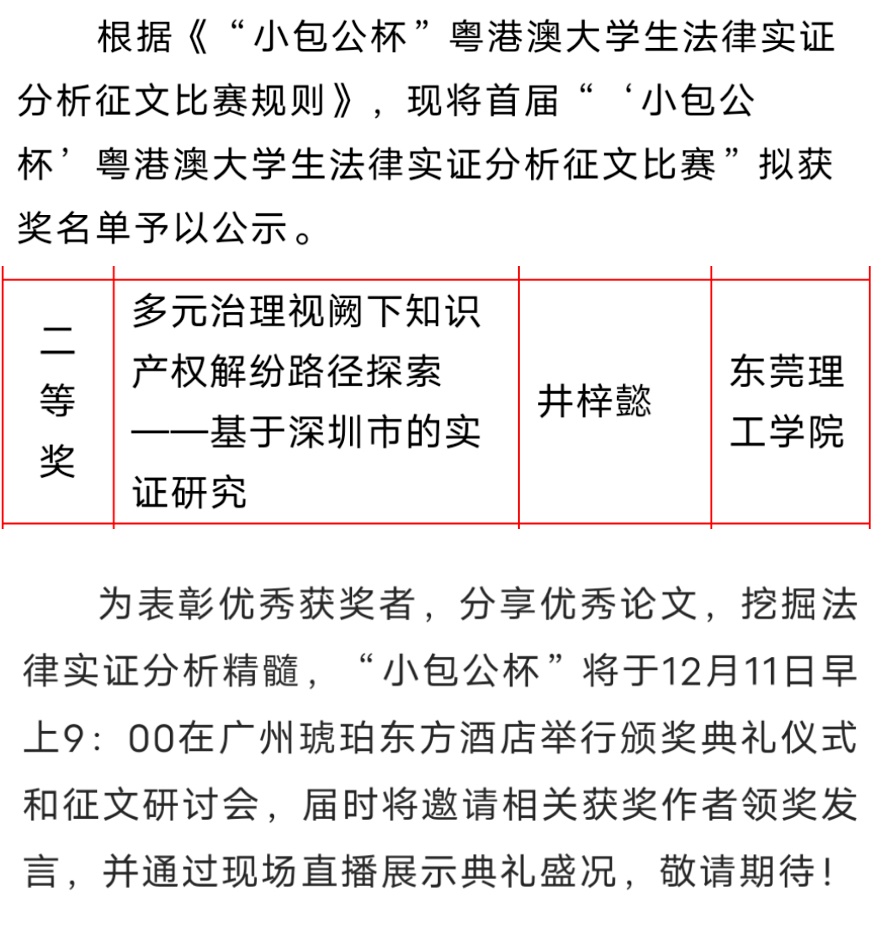 井梓懿同学的参赛作品《多元治理视阙下知识产权解纷路径探索——基于深圳市的实证研究》脱颖而出,荣获第一届“小包公杯”粤港澳大学生法律实证分析征文比赛二等奖。