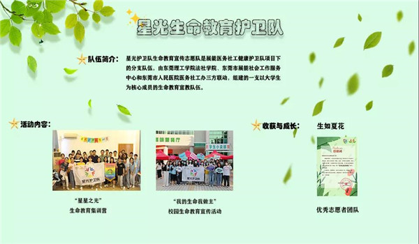 、东莞市展能社会工作服务中心和东莞市人民医院医务社工办三方联动,成立星光生命教育护卫队,致于组建一支以大学生为核心成员的生命教育宣教队伍,培育学生作为生命教育的同行者,向社会大众倡导生命教育与安宁疗护的理念和知识,让更多人认识和了解生死,尊重和珍惜生命。