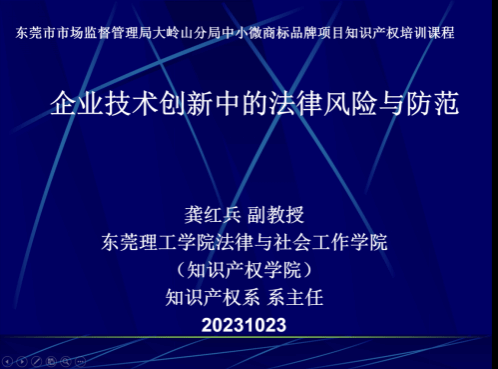 龚红兵副教授于2023年10月24日在大岭山新塘村村委会为50多家的企业家代表以《企业技术创新中的法律风险与防范》为题进行了知识产权讲座。