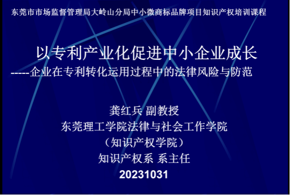 龚红兵副教授于2023年10月31日在大岭山百花洞村委会为30多家的企业家代表以《以专利产业化促进中小企业成长---企业专利转化运用过程中的法律风险与防范》为题进行了讲座。