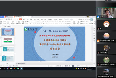 于2022年4月24日下午,通过腾讯会议举办了4.26知识产权宣传周暨2022年incoPat高校检索大赛决赛动员大会,出席会议的天下足球网