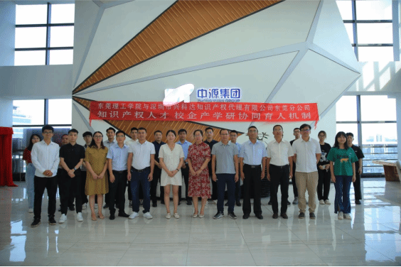 知识产权系胡庆乐特聘副教授;中源集团董事长冯玉玺,中源集团总经理、深圳兴科达知识产权人有限公司东莞分公司的创始人陈漫言,中源集团合伙人黄柏兴,中源集团总经办主任姚丽春,专利代理部部长胡助维,项目经理杜锡恒,出席了签约仪式。